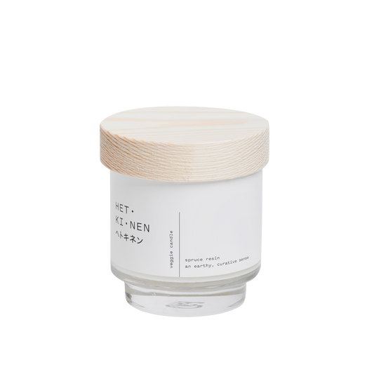 ヘトキネンのベジキャンドルは、キャンドル以上のもの ー それは小さな暖炉のよう。芯には、美しく、静かで安全な炎で燃える、フィンランドのアスペン(ポプラ)を使用しています。木製の芯は、使う前に黒い部分をトリミングすることで、常に美しく燃やすことができます。キャンドルに使用しているワックスは、菜種と大豆の植物性ワックス。火を灯している間に、まるで樹木の年輪のように、溶けたロウが美しい層をつくります。 ・BIOFILIA: 飾らない自然のままの美しさ、 鮮やかな緑、爽やかで生き生きとした香り ・SMOKE SAUNA: 無骨で薄暗い、タールの香りのスモークサウナ・SPRUCE RESIN: 土っぽさ、癒しの感覚、伝統的なスプルース(トウヒ)樹脂の香り・HAPPY HOLIDAYS: 至福のひととき、リラックスした、居心地の良い香り・KALEVALA: フィンランドの自然の匂いがする、民族叙事詩「カレワラ」の香り・METSÄ: 様々な香りのトーンを感じる、本物の森のような香り